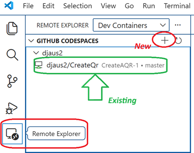 - In the Remote Explorer, under Codespaces, select your existing codespace.